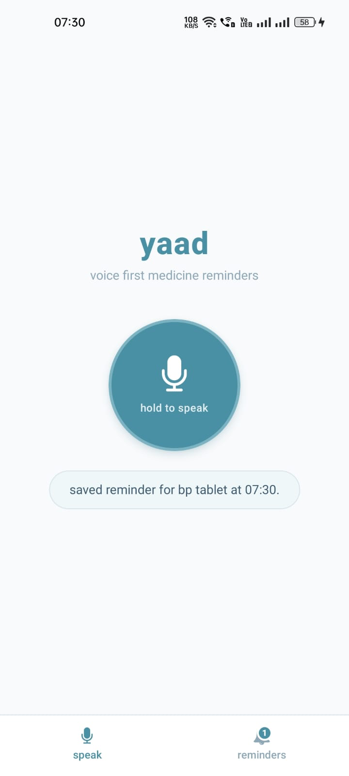 Yaad changes this. Just hold the mic and speak - in Hindi, Telugu, Tamil, or any Indian language. Say something like "roz subah 8 baje BP ki dawai yaad dilana" and Yaad understands, confirms back in your language with a warm voice, and reminds you every day at the right time. No typing. No menus. No confusion.