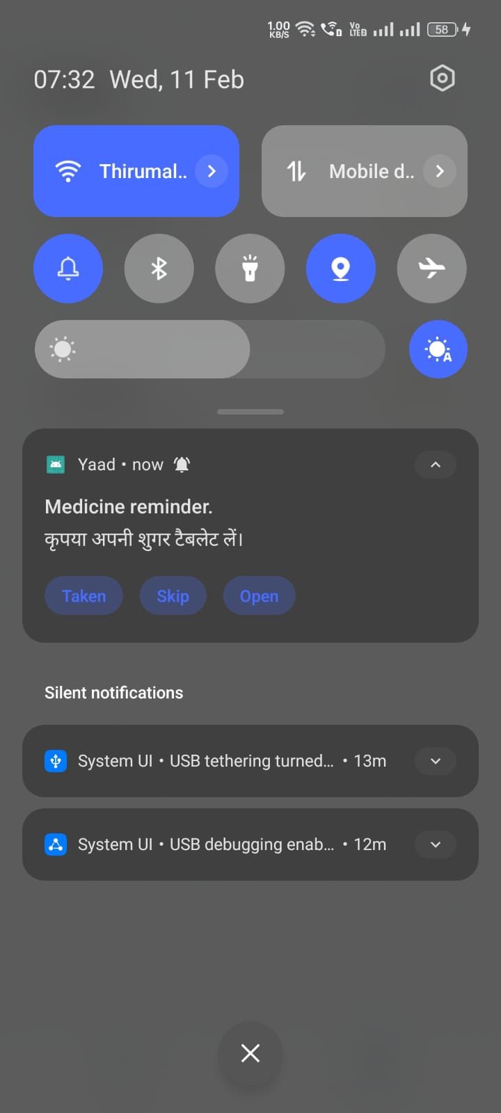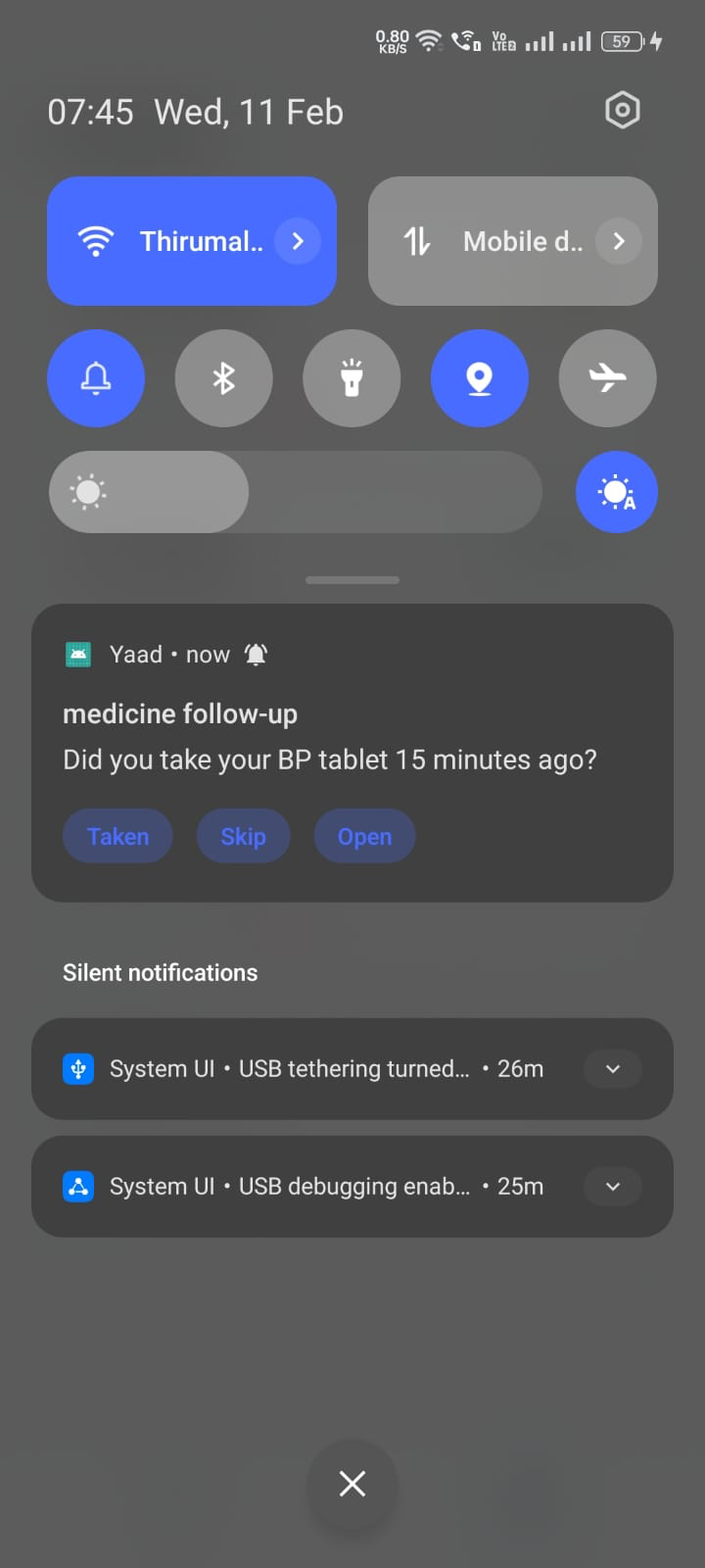 Each notification shows three buttons - Taken, Skip, and Open - so you don't even need to unlock the phone to respond. And if no one responds within 15 minutes, Yaad sends a gentle follow-up. Because one missed notification shouldn't mean a missed dose.