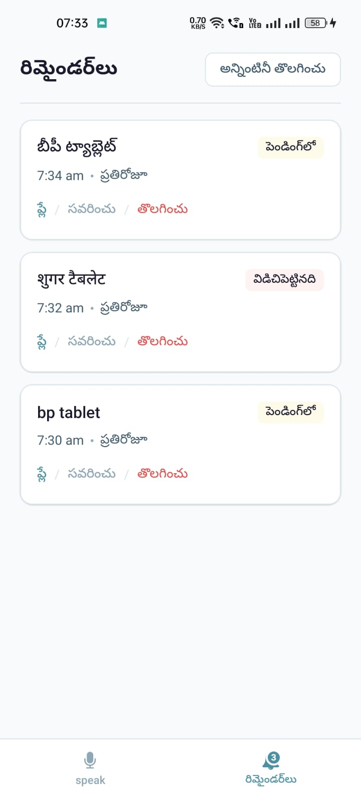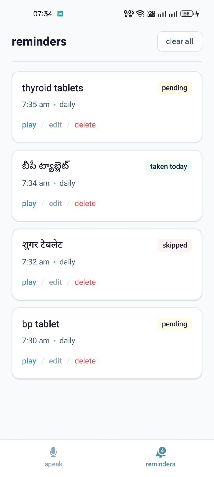 She's been prescribed 3 medicines at different times. She speaks into Yaad in Telugu for each one. The app confirms each reminder back to her in Telugu, and the notifications come in Telugu too. She doesn't need to read English or figure out any settings.